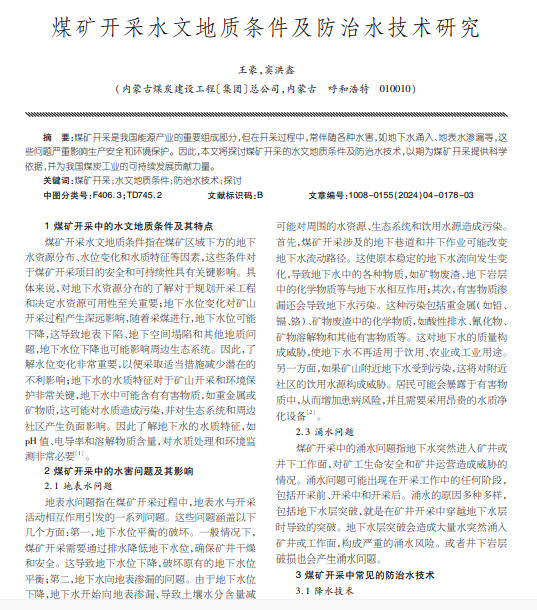 煤矿开采是我国能源产业的重要组成部分,但在开采过程中,常伴随各种水害"如地下水涌入,地表水渗漏等,这 些问题严重影响生产安全和环境保护。