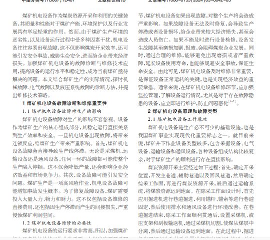 煤矿机电设备是生产的基础条件,其质量和性能对煤矿产能、环境保护以及行业发展都有重要作用。加强故障 诊断与维修技术应用,切实提高煤矿机电设备运行水平,满足设备使用需要,对于煤炭资源开采和利用具有积极作用。