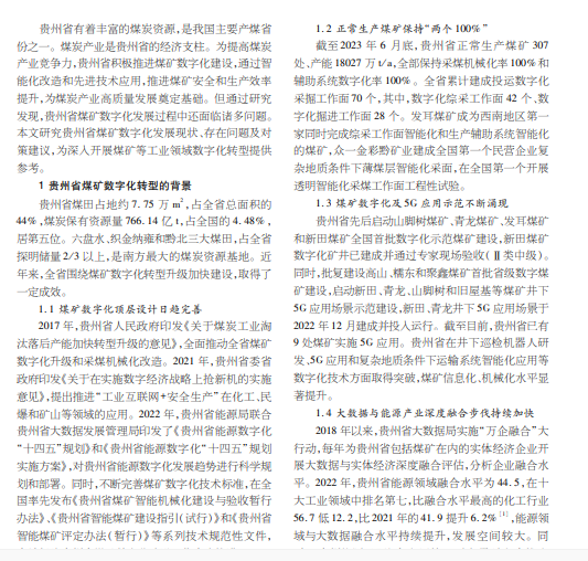 近年来,贵州省煤矿数字化转型升级取得一定成效,全省采煤机械化率、辅助系统数字化率均达到100% ,煤矿数 字化及5G应用示范不断涌现。