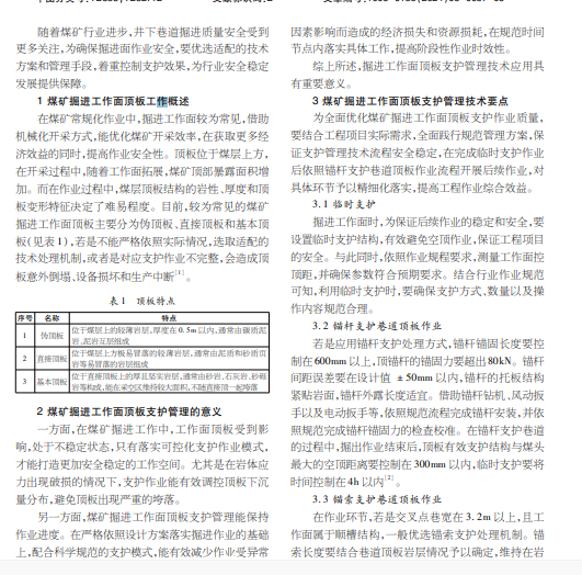 随着煤矿行业进步,井下巷道掘进质量安全受到更多关注,为确保掘进面作业安全,要优选适配的技术方案和管理手段,着重控制支护效果,为行业安全稳定发展提供保障。 1 煤矿掘进工作面顶板工作概述在煤矿常规化作业中,掘进工作面较为常见,借助机械化开采方式,能优化煤矿开采效率,在获取更多经济效益的同时,提高作业安全性。顶板位于煤层上方, 在开采过程中,随着工作面拓展,煤矿顶部暴露面积增加。而在作业过程中,煤层顶板结构的岩性、厚度和顶板变形特征决定了难易程度。目前,较为常见的煤矿掘进工作面顶板主要分为伪顶板、直接顶板和基本顶板(见表1),若是不能严格依照实际情况,选取适配的技术处理机制,或者是对应支护作业不完整,会造成顶板意外倒塌、设备损坏和生产中断[1]。