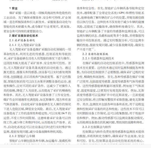煤矿采掘一直面临高风险、高成本和高劳动强度的挑战。为提高采煤效率、降低安全风险以及实现可持续发展, 煤矿采掘装备自动化与智能化技术应运而生。本文对煤矿采掘自动化技术进行论述,探讨采矿设备自动化、自动化控制系统 以及自动化安全措施等,并从人工智能、数据云平台以及虚拟现实与增强现实等方面探讨智能化技术在煤矿采掘中的应用。
