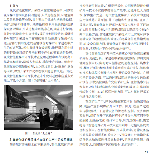 随着科学技术的不断进步,煤矿开采技术不断完善,逐渐智能化、自动化。现代智能化煤矿开采技术不仅提高了 煤矿开采效率,还减少了人力成本,降低生产风险以及保证生产安全。然而,目前我国煤炭开采技术还存在一些不足。本文 对现代智能化煤矿开采技术进行研究,分析现代智能化煤矿开采技术的主要应用领域及其作用,提出现代智能化煤矿开采技 术发展方向。