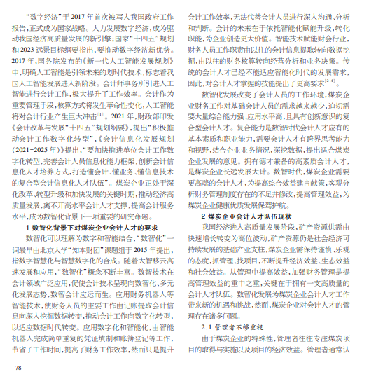 随着大数据、智能化和信息化发展,复合型会计人才队伍是煤炭企业高质量发展的重要支撑,单纯从事重复核算 工作的会计人员将被逐渐淘汰。本文分析数智化背景下煤炭企业对会计人才的要求以及会计人才现状,提出加强会计人才 队伍建设的路径。