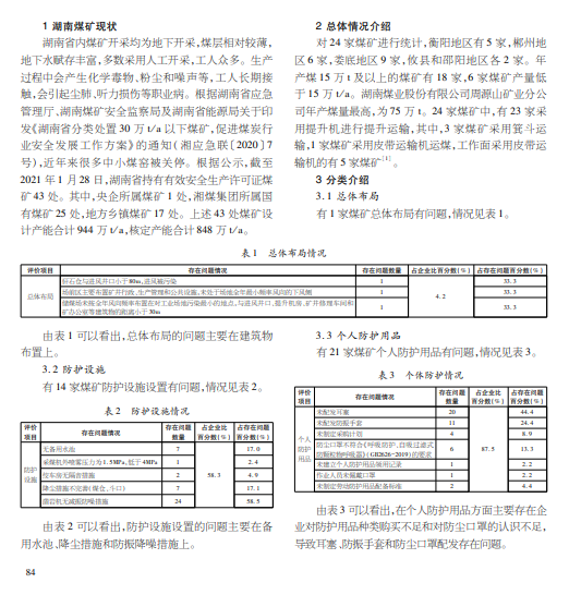 煤矿职业病防治工作面临着职业病多发等一系列问题,长期以来,这些问题并没有得到有效防治和根本消除,威 胁着煤炭企业职工的身心安全与健康。本文通过分析近几年湖南24家煤矿职业病危害现状评价报告,统计职业卫生管理中 存在的问题,希望对煤炭企业职业病防治工作提供借鉴。