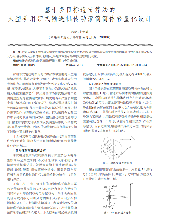 针对大型煤矿带式输送机传动滚筒轻量化设计要求,对某型号带式输送机传动滚筒筒体进行分区域加载及有限 元分析,基于有限元分析结果,利用多目标遗传算法对筒体结构参数进行优化。