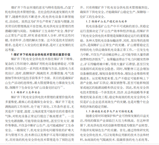 煤矿井下工作环境极为特殊,深入地下数百米,空气流通不畅、温度变化大、尘埃浓度高以及可燃气体泄漏风险 等因素,可能给井下工作带来巨大威胁,保障井下安全是重中之重。机电安全供电技术是保障井下安全极为重要的一个方 面,不仅能够确保矿井生产所需的电力供应连续、稳定,而且可以在供电系统出现异常时迅速隔离故障,保障矿工生命安全。 本文探讨煤矿井下机电安全供电技术的重要性和管理措施。