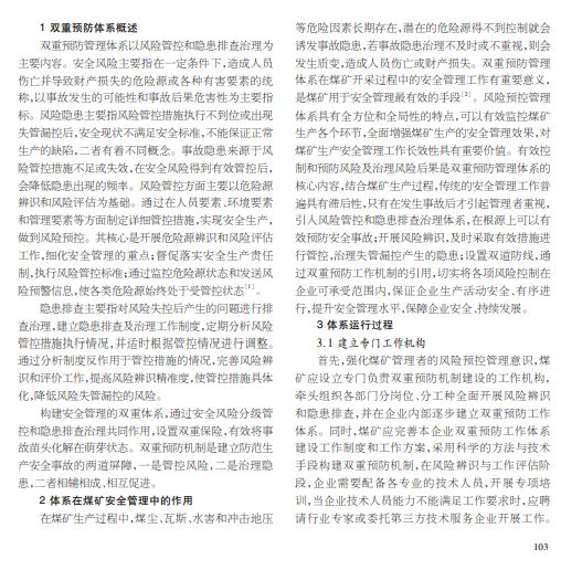 随着我国煤炭产业不断发展,安全形势持续严峻,煤矿重大安全生产事故时有发生,加强煤矿安全管理工作,维 护生命财产安全尤为重要。本文从风险管控和隐患排查治理的角度出发,分析双重预防管理体系,完善“风险管控在前、隐患 治理在后”的安全管理思路,提出实施策略。