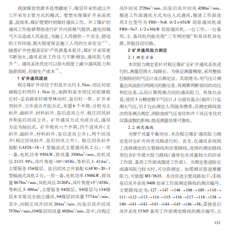 随着程庄煤矿开采深度和范围扩大,矿井供风紧张,矿井需风量增大,形成矿井通风阻力和井巷风阻增加的被动 局面,带来矿井通风不畅、主要通风机能力不够、通风压力损失大、风量调配困难以及矿井抗灾能力减弱等一系列安全问题。 本文以程庄煤矿矿井通风系统为研究对象,在对矿井通风阻力现场测定及计算机实时仿真的基础上,对井下通风系统进行 分析。