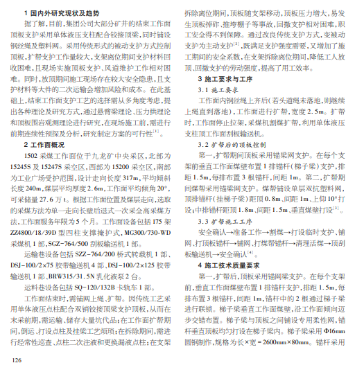 对于煤矿井下工作面末采期间的施工安全,扩帮后的顶板控制及相关施工工序流程是重要影响因素,合理选择 顶板控制以及施工工序,能提高生产安全性。本文以九龙矿1502综采工作面末采结束工艺为例,阐述和介绍新型结束支护工 艺研究与应用效果。