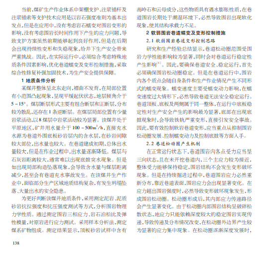 煤矿井下作业条件较为复杂,特殊地质条件下,深井巷道容易出现变形及破坏,导致支护难度增加,必须实现对 长期使用巷道的有效维护和变形监测。本文以某煤井地质条件为例,说明软弱围岩巷道蠕变及变形的控制措施,提出轨道大 巷联合修复补强加固技术应用方式。