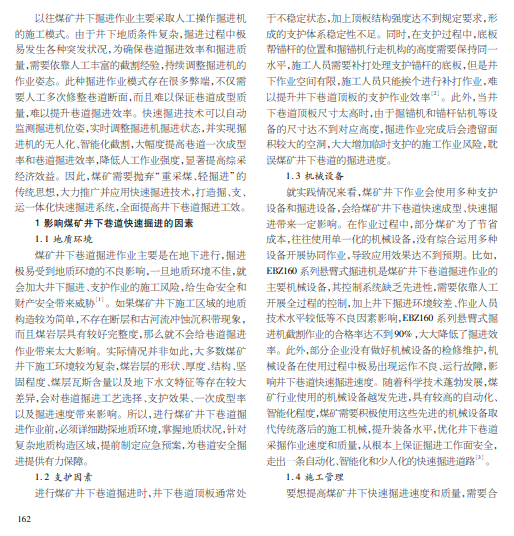 随着科学技术深入发展,煤矿井下综采作业装备自动化水平持续提升,一种新型的煤矿井下巷道快速掘进技术 应运而生。快速掘进技术在提高巷道成型质量、保证巷道掘进效率以及增加掘进安全系数等方面发挥显著作用,广泛应用于 煤矿井下作业。本文对煤矿井下快速掘进技术的应用进行研究和探索。