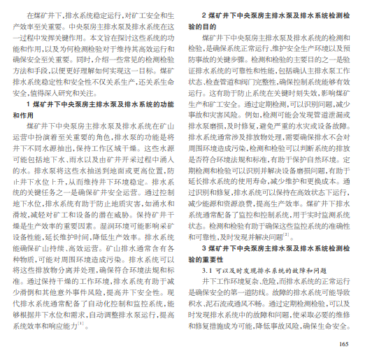 本文探讨煤矿井下中央泵房主排水泵及排水系统的重要性,着重介绍其功能、作用和检测检验目的,分析检测检 验的重要性,包括及时发现问题、确保系统高效运行和增强安全保障意识。本文还提出一些方法和手段,如定期进行设备检 测和维护、使用先进的检测仪器和建立检验标准,强调确保排水系统的稳定性和安全性。