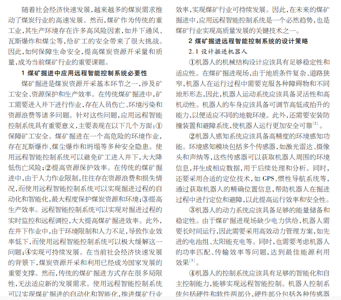 本文旨在设计和发展一种适用煤矿掘进的远程智能控制系统,解决煤矿工人生命安全,提高资源开采效率问题。