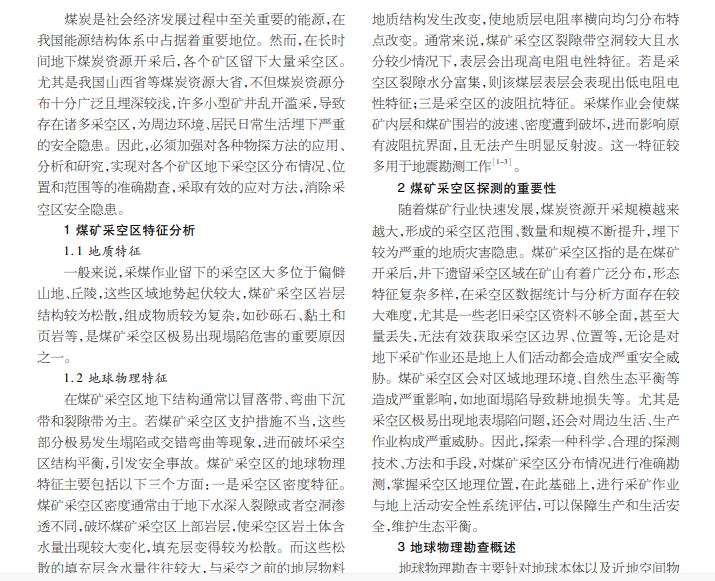 煤炭是我国十分重要的能源。加强对煤炭资源的开采勘查,是提高煤矿产量与实现安全采煤的重要措施,而对 煤矿采空区的勘查更是确保周边地质安全的重要措施。