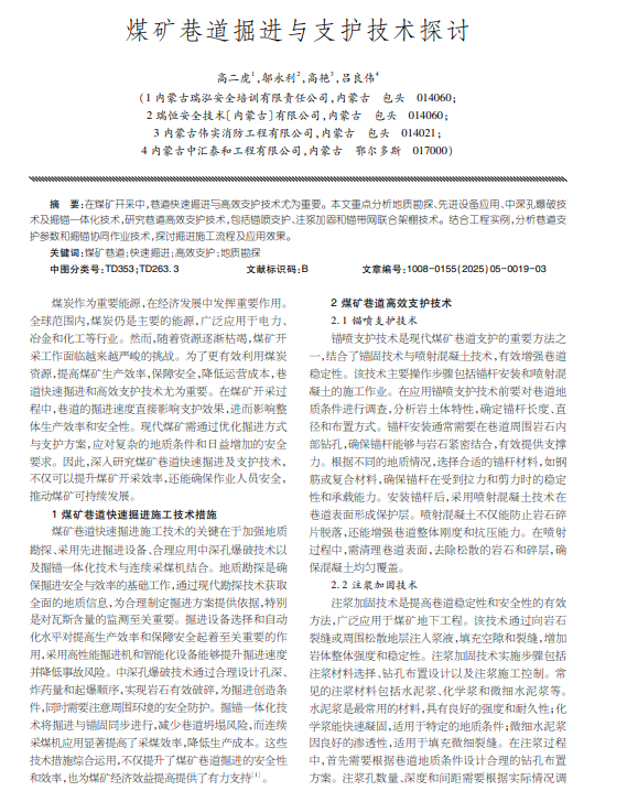 在煤矿开采中,巷道快速掘进与高效支护技术尤为重要。本文重点分析地质勘探、先进设备应用、中深孔爆破技术及掘锚一体化技术。
