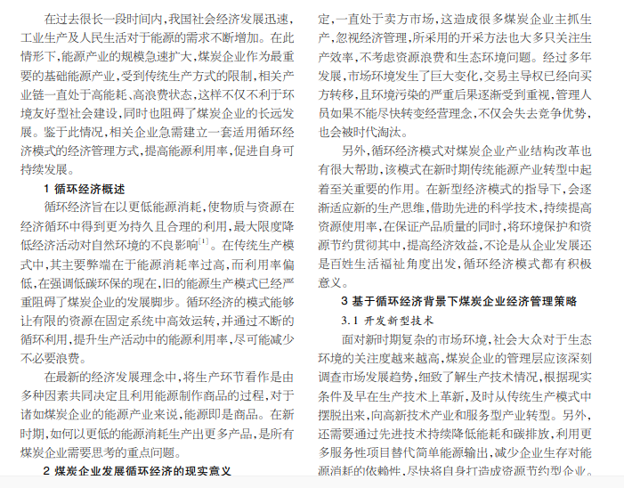 基于循环经济视域下的 煤炭企业经济管理措施分析