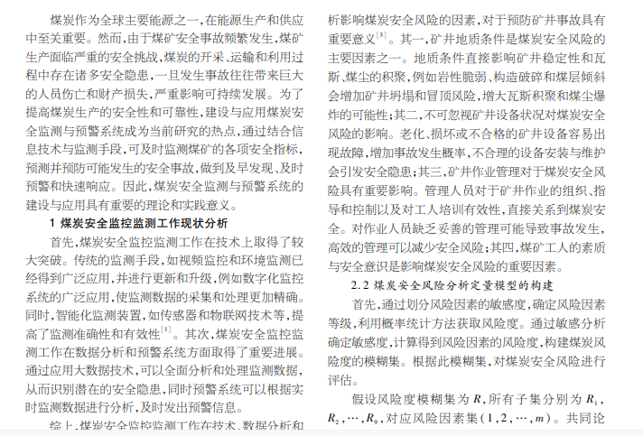 随着煤炭工业快速发展,人们对煤炭安全问题的关注度越来越高,为了提高煤炭生产安全性,煤炭安全监测与预 警系统的应用势在必行。