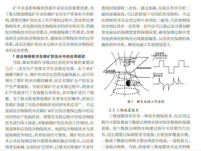 本文首先针对综合物探技术在煤矿防治水工作中的应用现状进行分析,然后阐述了综合物探技术的主要类型,最后针对综合物探技术在煤矿防治水的应用以及优化策略进行探究。