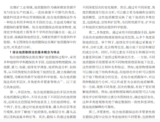 综合地质勘探法是一种多层次,多角度的勘探方法,在煤矿地质勘探中得到广泛应用。