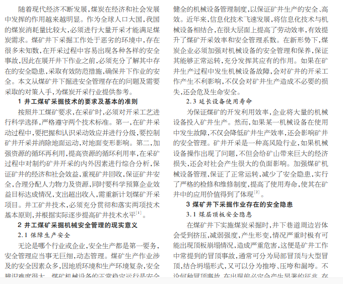 井工煤矿采掘;机械化现状;安全管理措施