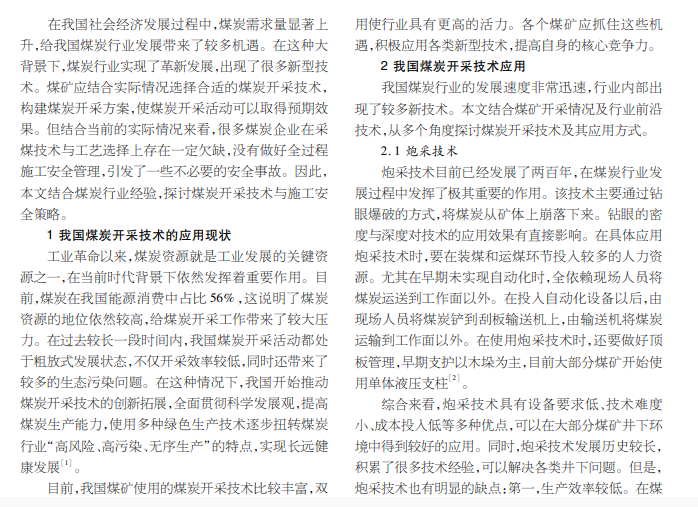 在煤炭开采过程中,选择合适的开采技术可以提高开采效率。同时,煤矿要做好煤炭开采全过程的施工安全控 制工作。