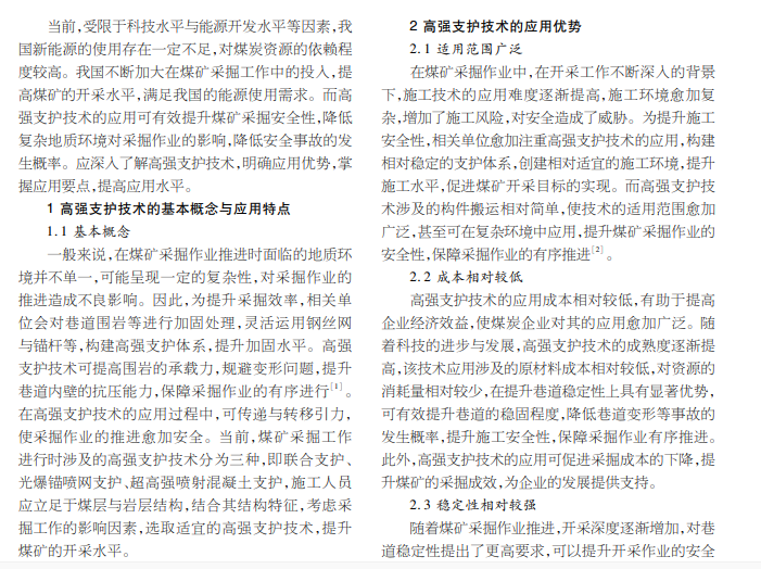 能源既是我国经济发展的主要动力,也是促进社会进步的基石。 应注重煤矿采掘技术研究和创新,提高高强支 护技术的应用水平。