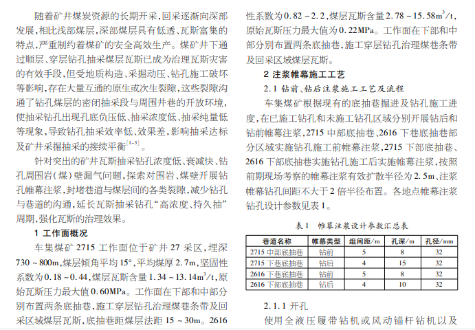 为了提高底板抽放巷抽采钻孔的抽采浓度和纯量,探索应用超前或钻后钻孔帷幕的注浆技术,在岩层中施工钻 孔后带压注入水泥浆液。