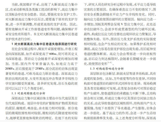 大断面高应力集中区;巷道支护;技术应用